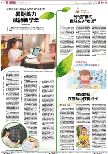 1.一起阅读疫情防控这本大书,学会用探究的目光观察疫情,记录海南战“疫”的感人故事和瞬间,上好“疫”场人生大课。家长应引导孩子学会用科学理性的态度辨别疫情信息的真伪,构建正确的世界观、人生观和价值观;拿起手中的笔,用作文、绘画向抗疫英雄致敬。同时,疫情也给人类提供了反思和审视生命的机会。疫情提醒人们认真审视自己的生活,让人类懂得敬畏。