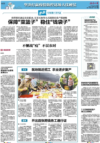 怎么办?一份文件让符世赞看到希望。8月24日,儋州市疫情防控工作指挥部农村防控专班印发了关于做好疫情期间农业生产工作的通知,明确低风险区生产用工雇主确需在该市跨镇使用低风险区劳务用工的,按“四定”(定线路、定人员、定车辆、定时间)要求进行管理。