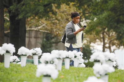 一名女子从美国纽约炮台公园内为悼念枪支暴力遇难者摆放的白色瓶花旁走过。 新华社/路透