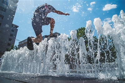 图为一名男子在匈牙利布达佩斯的喷泉广场享受清凉。新华社/美联