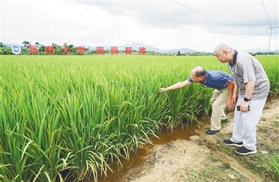 农业专家在海南大学南繁基地查看水稻长势。 武昊 摄