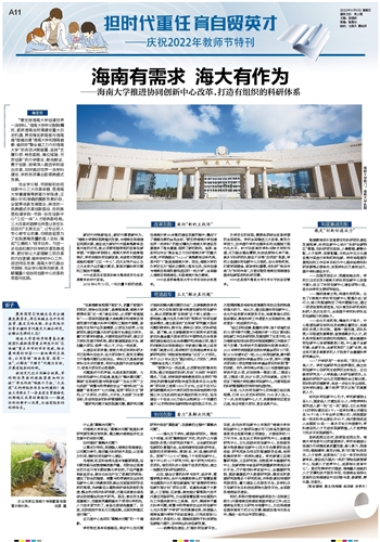 完全学分制、书院制和协同创新中心三大改革举措,是海南大学遵循高等教育办学规律,正确认识和准确把握新发展阶段,全面贯彻新发展理念,探寻的一条跨越式改革创新路径,目的就是构建学院-书院-协同创新中心“三位一体”人才培养新格局。三大改革的首要任务是让各支队伍回归“主责主业”,让专业的人专心做专业的事,归根结底是为了实现更高质量的育人目标,落实“立德树人”根本任务。为进一步总结和展示好学校改革发展成果,更好地让大家理解三项改革的内在逻辑,服务学校中心工作、促进师生发展,海南大学已推出书院制、完全学分制系列报道,本期着重介绍协同创新中心改革的思路与实践。