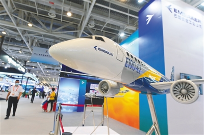 图为巴西航空工业公司展位展出的E190-E2飞机模型。新华社记者 林善传 摄