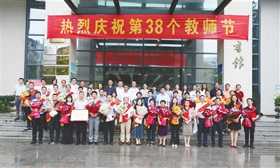 九月九日下午,海南师范大学举办“迎接党的二十大 培根铸魂育新人”主题教师节座谈会,会后与会人员合影留念,欢庆第三十八个教师节。 (海南师范大学供图)