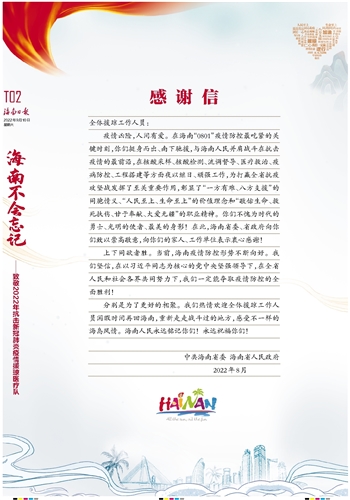 疫情凶险,人间有爱。在海南“0801”疫情防控最吃紧的关键时刻,你们挺身而出、南下驰援,与海南人民并肩战斗在抗击疫情的最前沿,在核酸采样、核酸检测、流调督导、医疗救治、疫病防控、工程搭建等方面夜以继日、顽强工作,为打赢全省抗疫攻坚战发挥了至关重要作用,彰显了“一方有难、八方支援”的同胞情义、“人民至上、生命至上”的价值理念和“敬佑生命、救死扶伤、甘于奉献、大爱无疆”的职业精神。你们不愧为时代的勇士、光明的使者、最美的身影!在此,海南省委、省政府向你们致以崇高敬意,向你们的家人、工作单位表示衷心感谢!