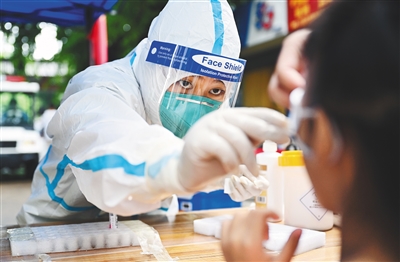 在三亚市天涯区南边海渔村,援琼医疗队的医护人员原清怡为居民做核酸检测。新华社记者 郭程 摄