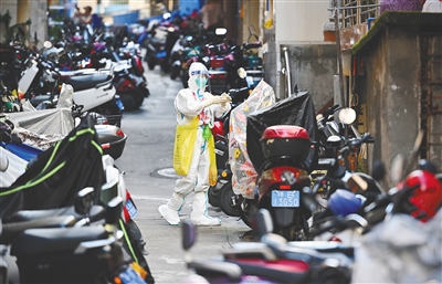 援琼医疗队核酸采集扫街队队员开展上门服务。 本报记者 陈元才 摄