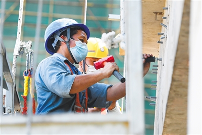 近日,工人在海口市复兴城互联网信息产业园二区复兴城国际数字港项目工地施工。