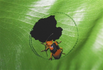 近日,五指山山脉北麓,叶甲虫在夜间“画”圆圈切断海芋叶子传递毒素的大部分叶脉通道,尽情享用美食。 本组图片均由本报记者 李天平 摄