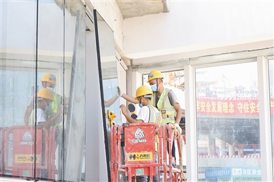 海南陵水黎安国际教育创新试验区图书馆项目现场,工人正在安装幕墙玻璃。中建五局供图