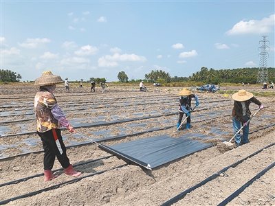 陵水光坡镇武山村大补山田洋里,村民们正在铺设地膜。