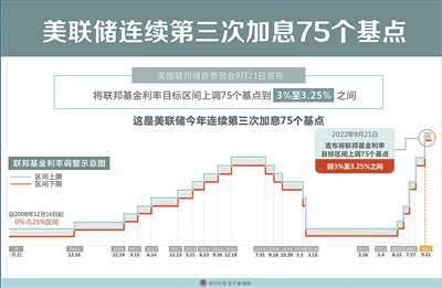 美联储主席鲍威尔6月宣布美联储28年来首次加息75个基点时曾表示,加息75个基点非同寻常,预计这种幅度的加息不会经常出现。然而,美联储9月21日结束为期两天的货币政策会议后,宣布将联邦基金利率目标区间上调75个基点到3%至3.25%之间,这是短短几个月来的第三次。