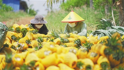 在万宁市山根镇田间地头,农户在包装菠萝。 海南日报记者 袁琛 摄