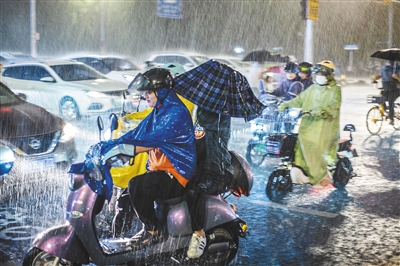 9月27日,在海口南海大道和龙昆南路交叉口,市民骑电动车冒雨出行。本报记者 李天平 摄