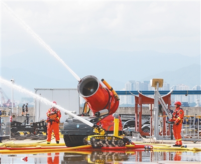 “哗哗哗……”伴随着机器的轰鸣声,一股巨大而强劲的水柱从排管口喷涌而出。9月27日,在海南消防三亚消防救援支队操场上,一台小型机器人从一辆厢式消防车的后备箱缓缓驶出,并在消防救援人员的遥控操作下,左右前后移动,喷涌而出的水柱如一条蛟龙。