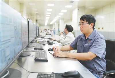 邯宝炼钢厂特档技术主管、转炉车间副主任唐笑宇(右)在转炉车间控制室工作。 新华社发