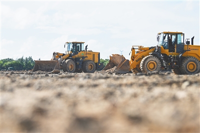 10月3日,工程车辆在位于洋浦经济开发区的洋浦海上风电产业园项目工地施工。据悉,洋浦目前已落地申能电气风电新能源装备产业等项目,从事海上风力发电机组的装配、出厂试验等,有序发展海上风电产业。新华社记者 蒲晓旭 摄