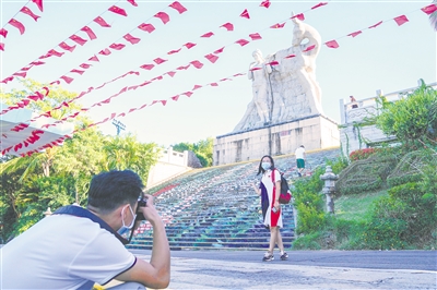 10月3日,游客在三亚鹿回头风景区拍照打卡。