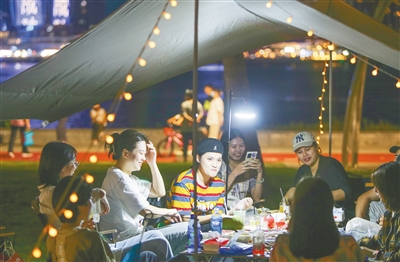 10月2日,夜幕下的海口湾世纪公园,市民游客在露营。见习记者 王程龙 摄