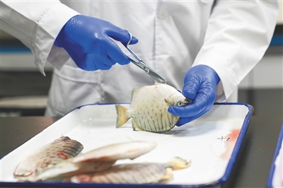 “给鱼类剥皮难度大,需要紧握解剖刀小心翼翼地从鱼的腹壁切入,用刀尖轻轻地将鱼皮和鱼肉分离,一直剥到背鳍基部。”陈攀一边演示一边说,为了防止鱼鳞脱落,整个过程他几乎大气都不敢喘一下,鱼皮太薄,操作时要非常细心,要做到剥制的鱼皮厚薄均匀,避免出现鱼皮破损,影响标本质量。