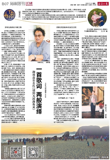 巧的是,海南日报口述历史研究中心主任、《口述海南·葩姐说》主讲人蔡葩的父亲蔡明康先生,1982年曾陪郑南先生一行去海南岛西部采风,亲历了一段《请到天涯海角来》的诞生过程。蔡明康曾将这段经历撰文发表于《海南日报》,取名《火车上“哼”出来的歌曲——<请到天涯海角来>》。
