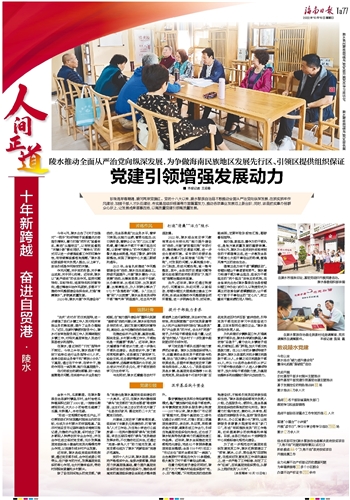 ■ 本报记者 王迎春珍珠海岸春潮涌,陵河两岸党旗红。党的十八大以来,陵水黎族自治县不断推动全面从严治党向纵深发展,在抓实抓牢作风建设、加强干部人才队伍建设、夯实基层组织根基等方面着重发力,推动各项事业发展迈上新台阶;同时,该县把实事办到群众心坎上,让发展成果普惠百姓,以高质量党建引领高质量发展。