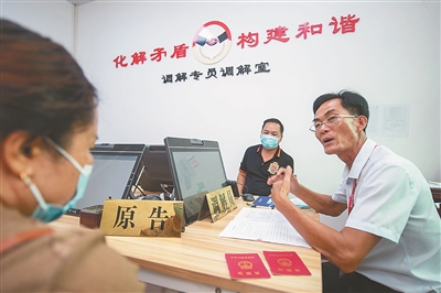 在陵水黎族自治县法院新村法庭调解室,党员调解员在调解案件。本报记者 袁琛 摄