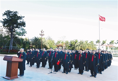 在国家第八个宪法日,海南一中院全体法官举行升国旗暨宪法宣誓仪式,推进“宪法宣传周”系列活动。 海南一中院供图