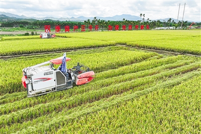 三亚把发展种业科技放在突出位置,积极开展种源“卡脖子”技术攻关,全力推进“南繁硅谷”建设,赋能打赢种业翻身仗。图为5月6日,在三亚市崖州区(坝头)南繁公共试验基地试验示范点稻田,收割机在收割早稻。