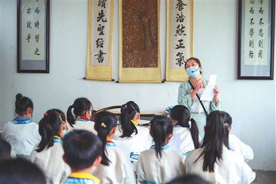 儋州东坡书院新时代文明实践站,儋州第六小学的学生吟诵诗词。本报记者 袁琛 摄