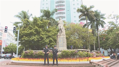 在琼海市有这么一道靓丽风景线——藤罗雨树下,“乐商义警队”队员在维持社会秩序,劝导市民文明出行,引导车辆规范停放。