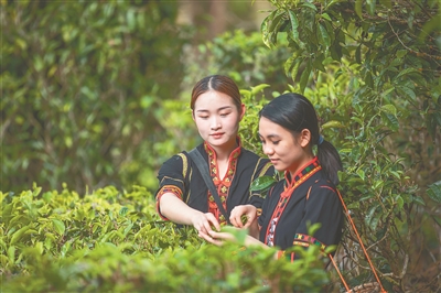 在五指山市水满乡方龙村的茶园里,村民采摘春茶。