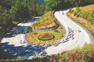 自行车队在五指山市阿陀岭公路赛道上骑行。 五指山市委宣传部供图