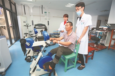 定安县人民医院医生给病人做康复训练。黄祥 摄