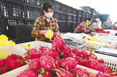 近日,东方市进入火龙果采收期,工人在一处种植基地包装火龙果。
