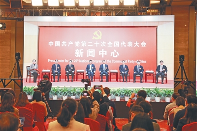 10月19日,党的二十大新闻中心举行第三场集体采访,山东、河南、湖北、湖南、广东、广西、海南代表团新闻发言人出席,介绍代表团学习讨论二十大报告情况,并回答记者提问。本报特派记者 韦茂金 摄