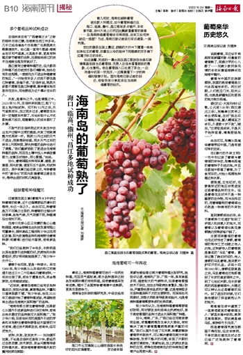 文\海南日报记者 刘婧姝曾几何时,海南也能种葡萄被无数人怀疑过,如今葡萄种植已在海口、临高、儋州、昌江等地多点铺开,丰收季节里,琼州大地上已然四处飘散着葡萄的果香……在海南种植葡萄曾经非常艰难,后来又如何突破这一难题?为此,海南日报记者进行采访调查,一探究竟。