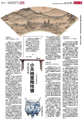 尽管古人的书房大都面积不大,但其间陈设却颇为讲究。清代文人李渔曾提出:“安器置物者,务在纵横得当,使人入其户登其堂,见物物皆非苟设,事事具有深情。”古人的书房,除了摆放桌、椅、橱、灯具及笔、墨、纸、砚等基本物品外,往往还会设几榻、挂古琴、立香炉、悬字画、置古玩、配宝剑、养盆栽、饲金鱼,营造出高雅别致的氛围。