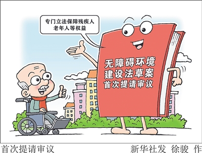 新华社北京10月27日电 (记者高蕾)无障碍环境建设法草案27日提请十三届全国人大常委会第三十七次会议初次审议。这是我国首次就无障碍环境建设制定专门性法律。无障碍环境建设是残疾人、老年人等群体权益保障的重要内容,对于促进社会融合和人的全面发展具有重要价值。制定无障碍环境建设法,是坚持以人为本、尊重和保障人权的重要体现,是实施积极应对人口老龄化国家战略的必然要求,是切实提高无障碍环境建设质量的有力保障。