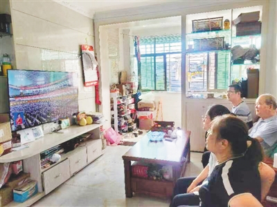 10月22日,澄迈县69岁的老党员洪光业一家三代,围坐客厅收看党的二十大相关报道。(受访者供图)