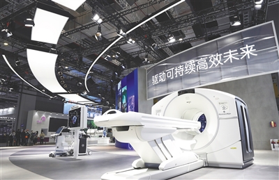 11月2日拍摄的美国GE公司在进博会展台展出的一台大型医疗设备。 新华社发