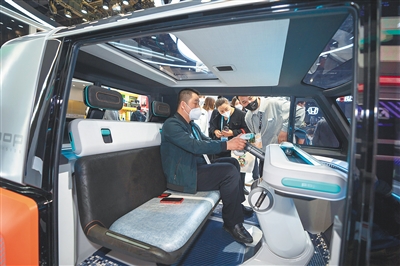 图为“摩比斯”的未来汽车概念产品吸引观展人士体验。 本报特派记者 袁琛 摄