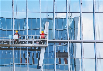 一系列的挑战,于振山和同事们冲锋在前。面对一台台先进的科研设备,他们集中学习每台设备的运行原理,确保设备顺利安装并成功运行;针对8、9号楼诸多大型设备尺寸与主体结构预留通道大小不符的难题,他们分层进场、穿插施工、耐心拆改,最大限度降低对建设进度的影响;冒着烈日,在升降曲臂车的配合下,他们一点点把金属型材固定到玻璃幕墙后的龙骨上……