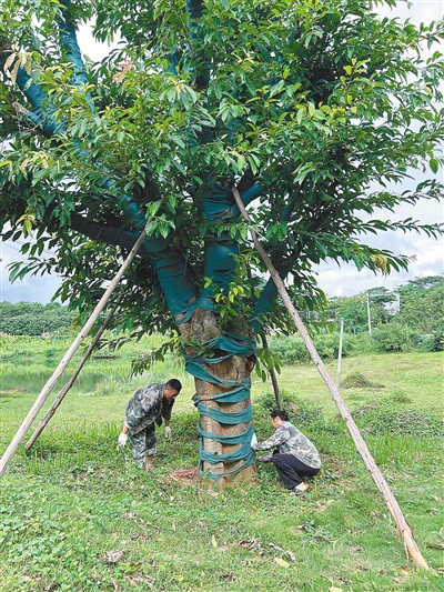 “对修剪后的枝杈,要迅速涂抹树木伤口愈合剂,还要给树身裹上保水棉布。”陈海宁说,装上货车的大叶榄仁,就像一个被裹得严严实实的粽子,工作人员通过货车将其运到目的地后,再小心固定于提前挖好的树穴,浇透定根水,并给树体输营养液进行后续养护。