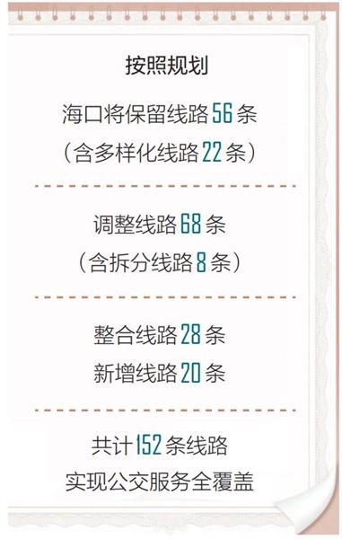 根据规划,今年底,海口实施中心组团线路,先期改善城市核心区的公交服务水平;2023年上半年,实施中心组团至长流组团、江东组团的线路,实现公共交通服务网络的整体优化。