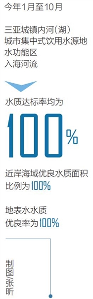 今年1月至10月,三亚城镇内河(湖)、城市集中式饮用水源地、水功能区、入海河流水质达标率均为100%,近岸海域优良水质面积比例为100%,地表水水质优良率为100%。