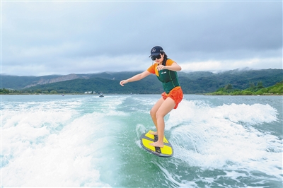 尾波冲浪是近年来兴起的滑水项目,通过造浪艇船尾造浪,产生可冲滑推进力的一种新式冲浪运动。