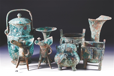 图为邵家棚遗址墓葬出土的铜礼器组合(资料照片)。新华社发(国家文物局供图)