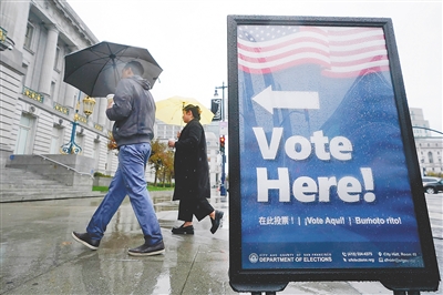 11月8日,人们打着伞走在美国加利福尼亚州旧金山的街道上。