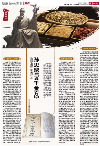 文\本刊特约撰稿 金满楼中国古代医学源远流长,从战国时期的《黄帝内经》到东汉末年的《伤寒论》,再到明朝的《本草纲目》,隋唐时期的《千金要方》无疑是其中承前启后的重要著作。《千金要方》又称《备急千金要方》《千金方》,是“药王”孙思邈所著,它也被誉为中国最早的临床百科全书。